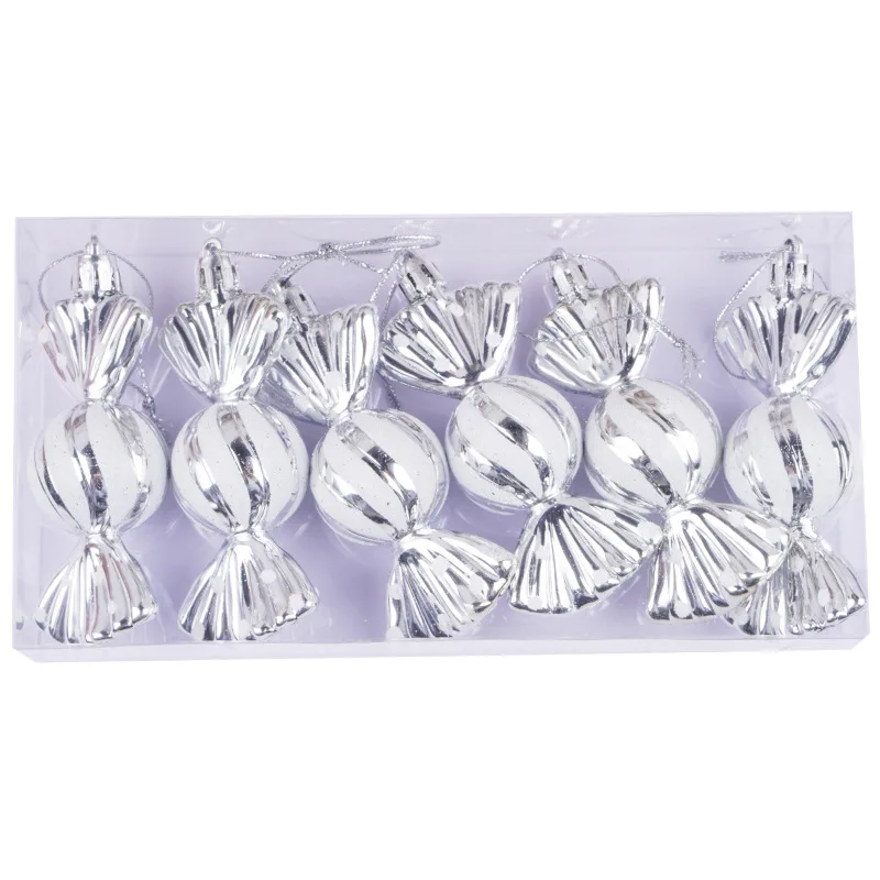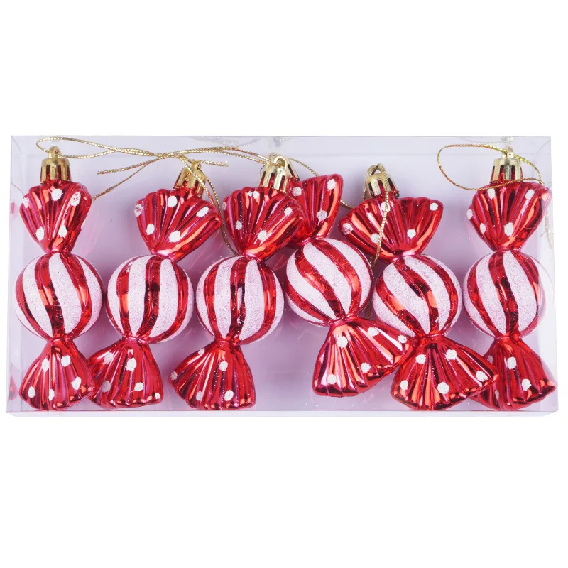 Christmas tree decorations, snowmen, faceless Santa Claus, candy sticks, colorful balls, small houses, Christmas atmosphere deco