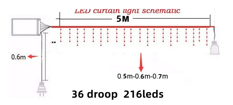 (5m,10m,15m.20m)*0.5/0.6/0.7m . 5m=36 droops 216leds.10m=72droops 532leds. 15m=108 droops 748leds. 20m=144droops 864les